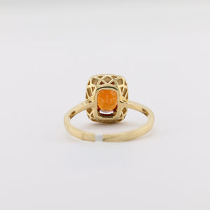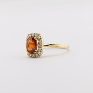 Vibrant and full of fire, this orange tourmaline ring radiates warmth and brilliance. The oval-cut gemstone glows with rich amber and flame-like undertones, its facets alive with shifting sparks of red and gold. Encircled by a halo of crisp white diamonds, the stone’s bold color is intensified, creating a dazzling play of contrast and light.